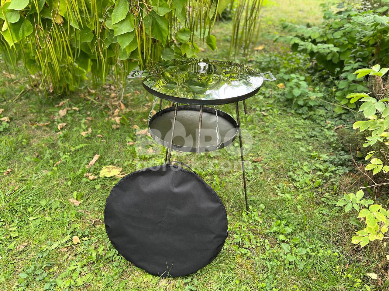У комплект входить сковорода товщиною металу 4 мм (діаметр 40 см або 50 см на вибір), кришка з нержавіючої сталі, з’ємні ручки (2 шт.), ніжки по 7 см, 25 см, 100 см (розбірні), дерев’яна лопатка, кільце в яке вкручуються ніжки, підвіс для розведення багаття та ланцюжка та чохол.